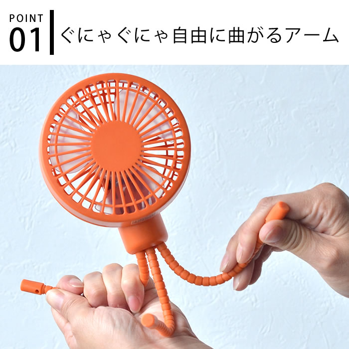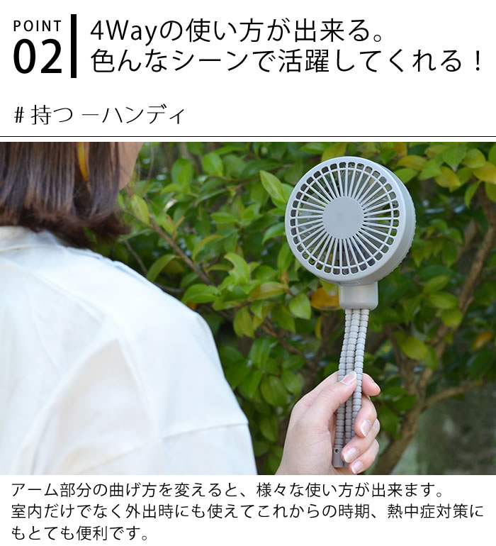 あらゆる場所に巻きつけたり、吊り下げたり、卓上に置いて・・など様々な場所で狙った所に風を送れるのが最大のポイントです。