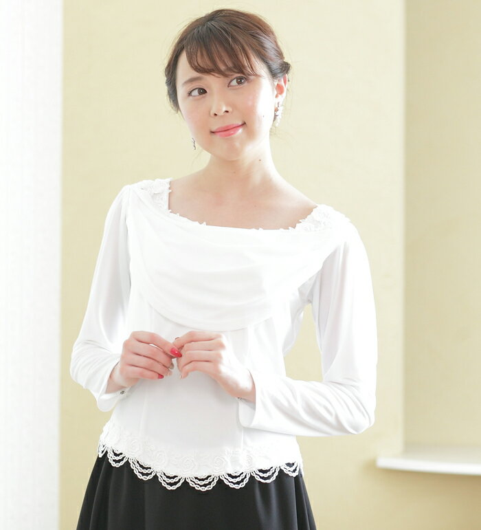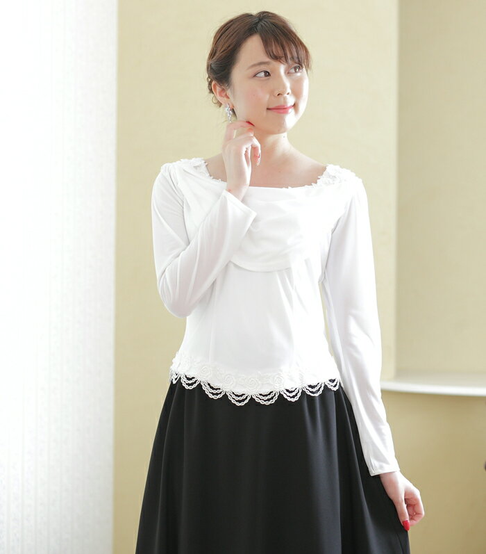 コーラス 衣装 白 黒 薔薇 ストレッチ ドレープ ブラウス [袖ストレッチ・クレープ地 タイプ]長袖 演奏会 オーケストラ 合唱 第九 ステージ衣装 発表会 トップス フォーマル 演奏会用ブラウス 舞台衣装 ミセス 大きいサイズ ダンス衣装 フリル レース コーデ(bl735)