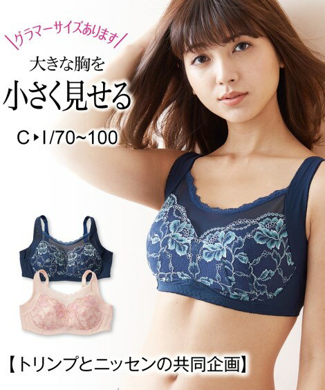 ブラジャー ノンワイヤー 大きいサイズ レディース グラマーバストを小さく見せるノンワイヤー編 トリンプ アプリコットベージュ/ネイビー C85〜H80 ニッセン