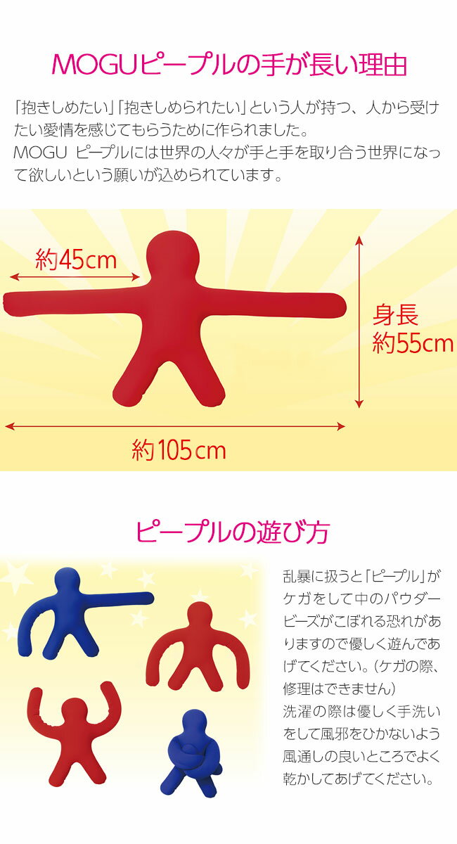 モグMOGUピープルロングアームふんわり♡やわらかな肌触りでやさしく包み込んでくれるMOGUピープル!手が長い理由は「抱きしめたい」「抱きしめられたい」という人が持つ、人から受けたい愛情を感じてもらうために作られました。